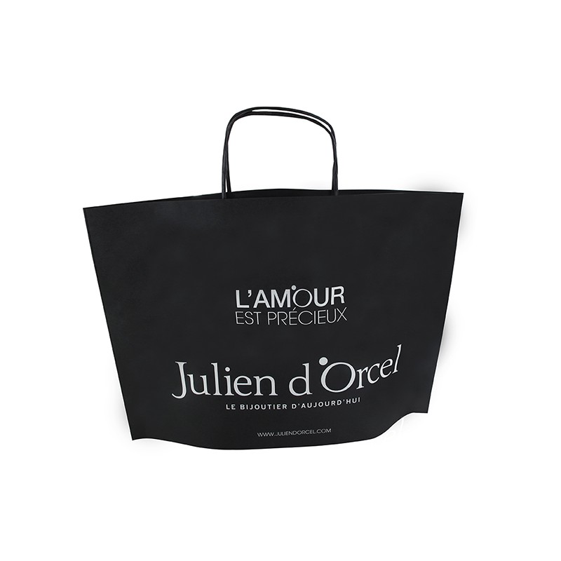 'Sacs krafts noirs avec soufflets de fond, 70 grs, protégés par vernis UV. Ils sont équipés de poignées de préhension torsadées noires et sont personnalisés avec le message 'l' amour est précieux' en blanc. Ce sac accueille vos étuis et écrins de votre collection Julien d'Orcel.