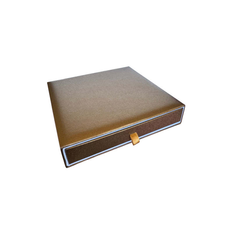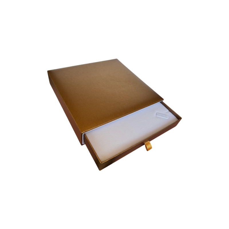 Cardboard box with sliding drawer, pencil box design with satin grip ribbon. Textured paper coating with iridescent effect. Inside the case covered with iridescent effect paper, high quality velvet insert. This case can be customised with hot foil stamping or pad printing.