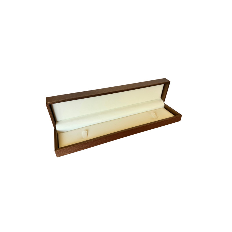 Ecrin, coque polymère pour bracelet, recouvert à l'extérieur d'un revêtement papier texturé effet irisé. Intérieur de l'écrin et insert en satin nacré. Livrés avec fourreau de protection de couleur et texture identique à l’écrin. Cet écrin est personnalisable en dorure à chaud ou tampographie.